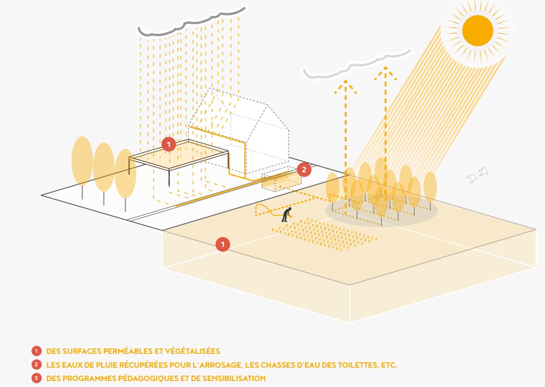- Récupération des eaux de pluie pour alimenter les chasses ;